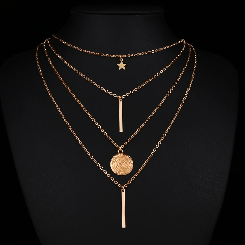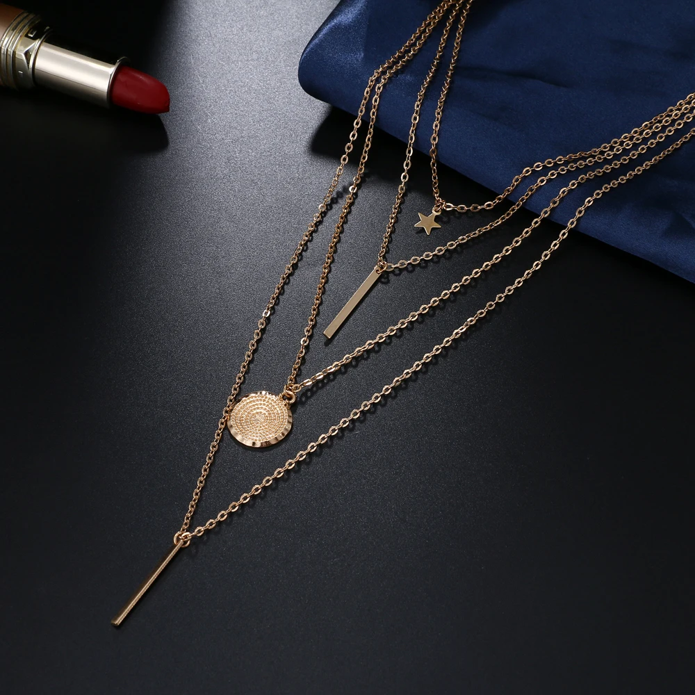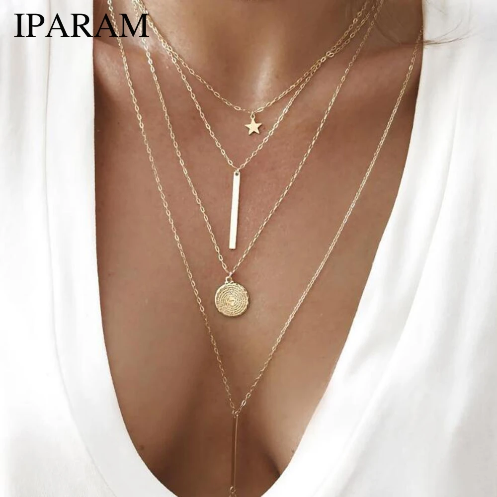 Promo IPARAM 2019 Vintage Bohemian Multilayer Round Star Necklace Ladies Layered Gold Long Rod Pendant Fa